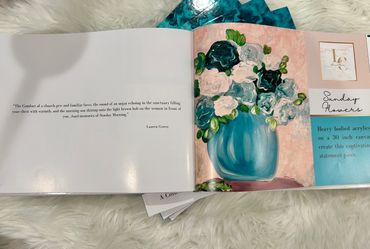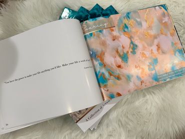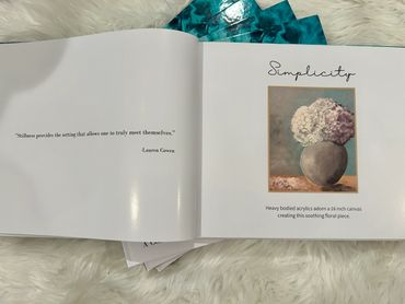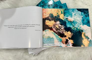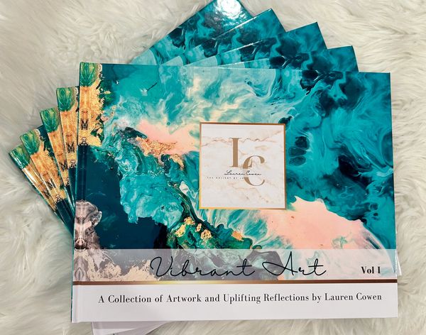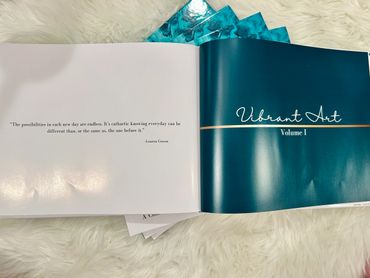 Vibrant Art: Volume I is an 11 x 8.5 inch hardcover book, printed on premium heavy weight high gloss paper to display each artworks vibrance. The book is created to display both elegance and style. It features 37 original artwork pieces by the Artist and 40 uplifting reflections. This book is the perfect addition to a countertop, coffee table, sofa table or bookshelf.